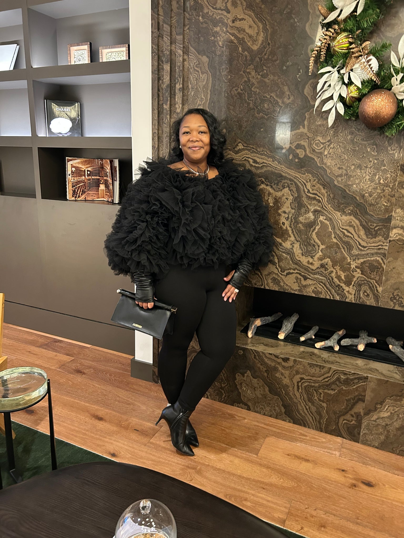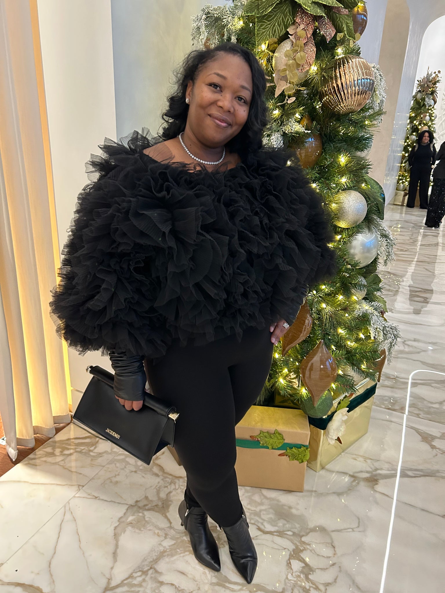 Full Ruffled Tulle Long Sleeve Top, Elastic in Sleeve & Waist with Good Stretch. A great statement piece to step out in. Model is wearing a L/XL